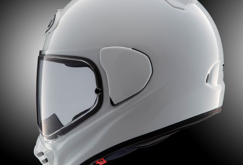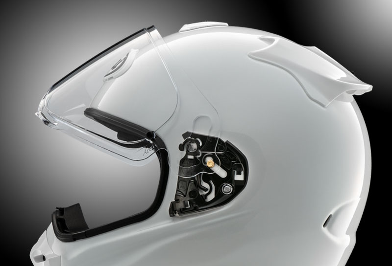 シールドシステムの位置を下げるということは、従来の構造では対応が難しかった領域、つまり通常はシールドの開閉機構を設けにくい低い位置にまで、取付部を設置しなければならないことを意味します。 その課題をクリアするために、アライは独自のVAS(Variable Axis System)機構を開発。シールドをスムーズな動きで可動させながら、より低い位置への装着を可能にすることで、帽体上部の滑らかな形状をいっそう広く確保できます。このVASシールドシステムにより、「かわす性能」のさらなる向上に大きく貢献しています。