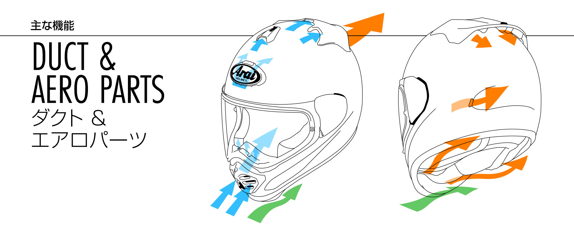さらにこのリアダクトは、頭部内のこもった熱気を効率よく排出する、エアーアウトダクトとしての機能も兼備。内部の空気を走行時の負圧によって引き出し、夏場や長時間走行時にも快適性を保ちます。