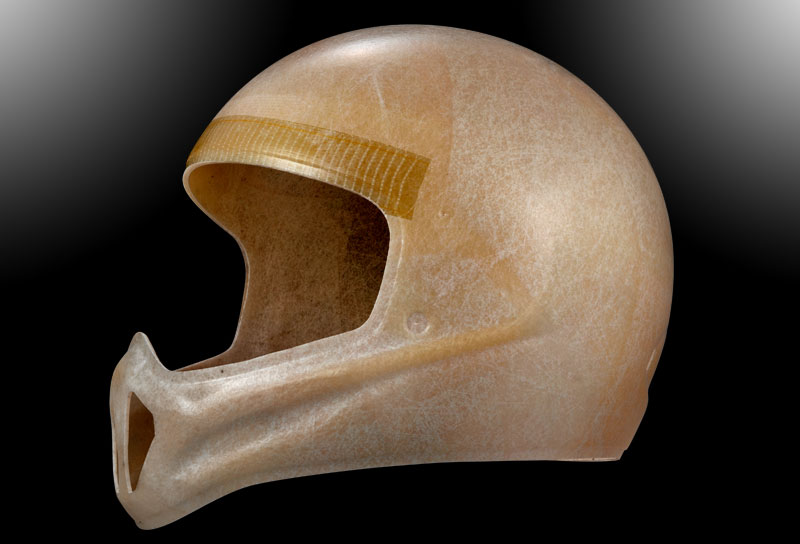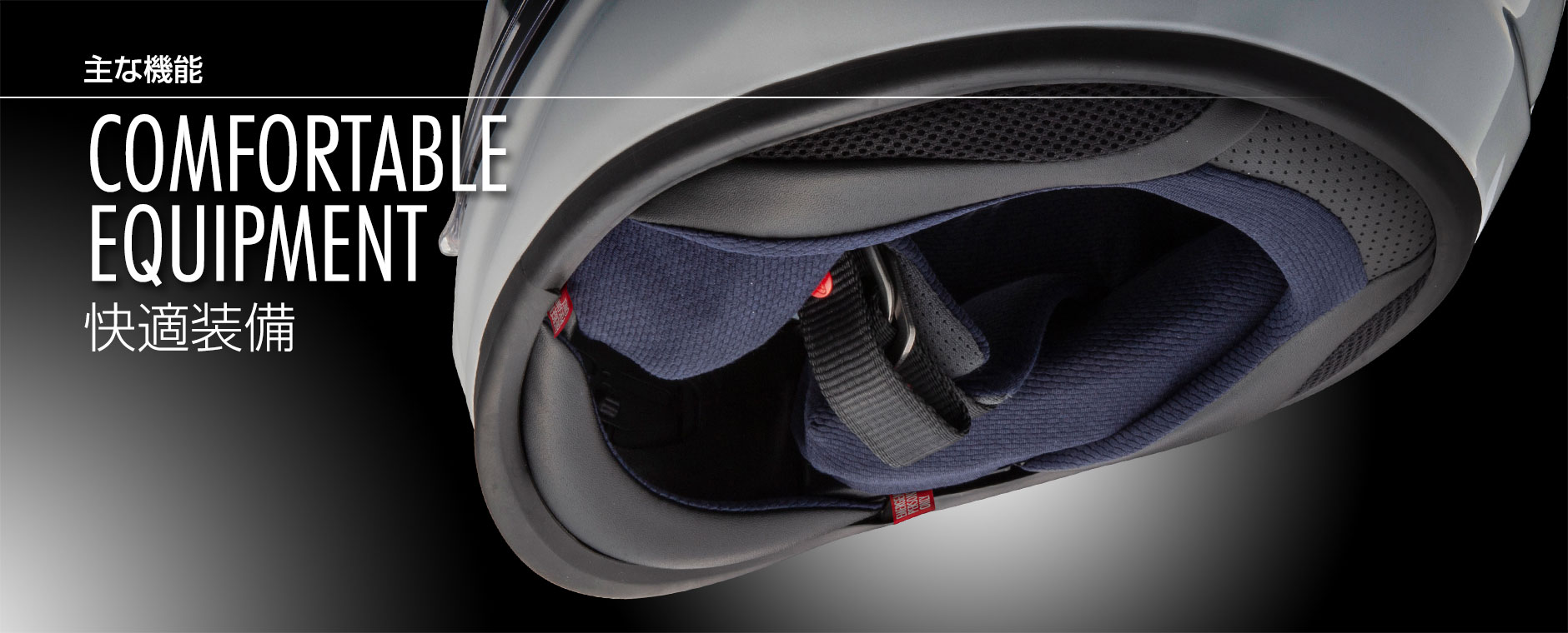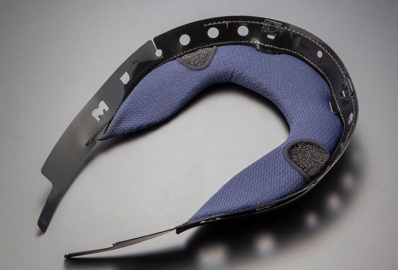 さらに、一点に集中するような衝撃に対しても、破壊されることなくかわす事のできる強靭なシェルにするため、20種類以上の部材を重ね合わせ成形。前頭部には、樽の箍(たが)の様に用いるスーパーファイバー製ベルトで強化しています。