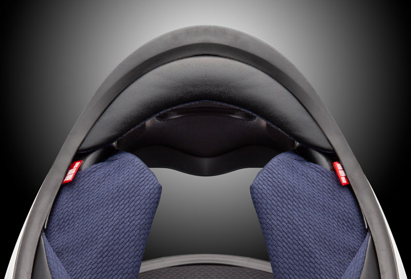 システム内装は、固定式内装の「深く、柔らかく」全体を包み込む内装を目指し、頭頂部パッドの形状を見直しました。髪型が大きく崩れない形状と位置調整と着脱を可能にし、サイド部厚み調整可能なアジャスタブル機能も兼ね備えた新開発システム内装です。