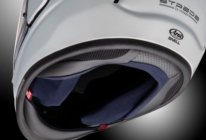いかなるヘルメットでも吸収できるエネルギーの大きさには限りがあるため、現実の事例での大きなエネルギーは、ヘルメットの中に入れないよう、かわすしかありません。だから、形状も衝撃をかわしやすい丸く滑らかなフォルムを追求してきました。〈TXストラーダ〉は、現実の事故での最も衝突が想定される範囲において、丸い曲線を連続させ、少しでも多くの衝撃をかわせるように、より滑らかな形状に進化させています。