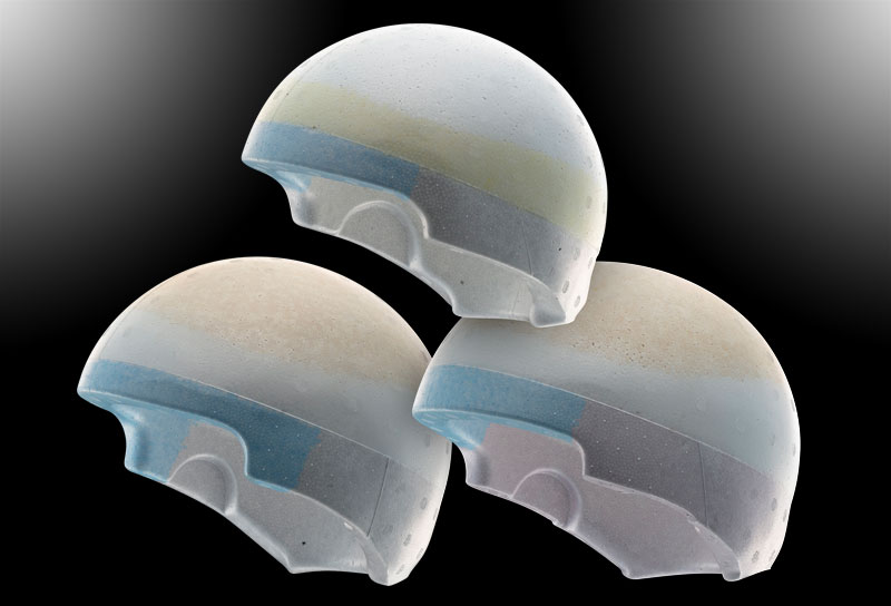 アライの多段発泡ライナーは、部位により細かくその硬度を変化させています。受ける面積により硬度を変化させることで、「かわす性能」を活かすフォルムを追求し続けることが可能となるのです。そして、一体成形の多段発泡ライナーは、硬度の変化に途切れることなく、衝撃を連続して受け止めることができるので、組み合わせ式のライナーよりも、実際の衝撃で有効に働くことができます。