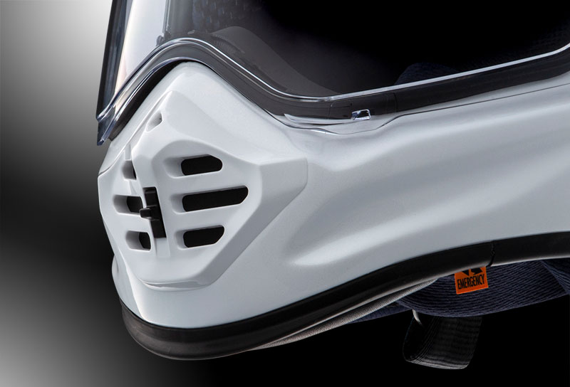 寒い日に暖かい部屋の窓が曇るように、ヘルメットも自らの呼気によってシールドが曇り、視界が妨げられることがあります。それを防ぐ役割を果たすのがノーズ・ディフレクター。シールド内面に直接呼気がかかることを防ぎ、シールドの曇りを軽減させます。 また、マウスシャッターから流入した外気を、直接目に当たらないように、口元とシールド方向にコントロールし、ライダーの目を守る役割もあります。 着脱式なので、気候や走りに応じてご使用ください。