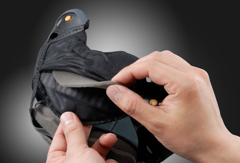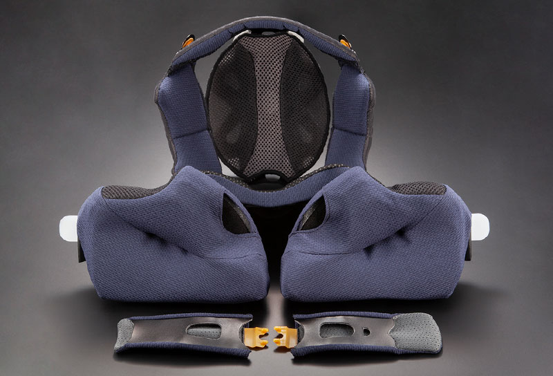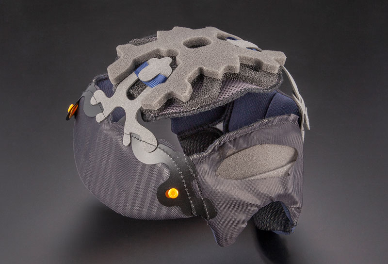 システム内装パッド部分には、取り外し可能な『調節パッド』を、左右側頭部と後頭部に配置。調節パッドを取り除くことで、約5mmずつ緩くすることができます。標準仕様でキツさを感じる場合には、簡単に自分の頭のサイズに微調整が行えます。(取扱説明書を良く読んでから、調整してください)