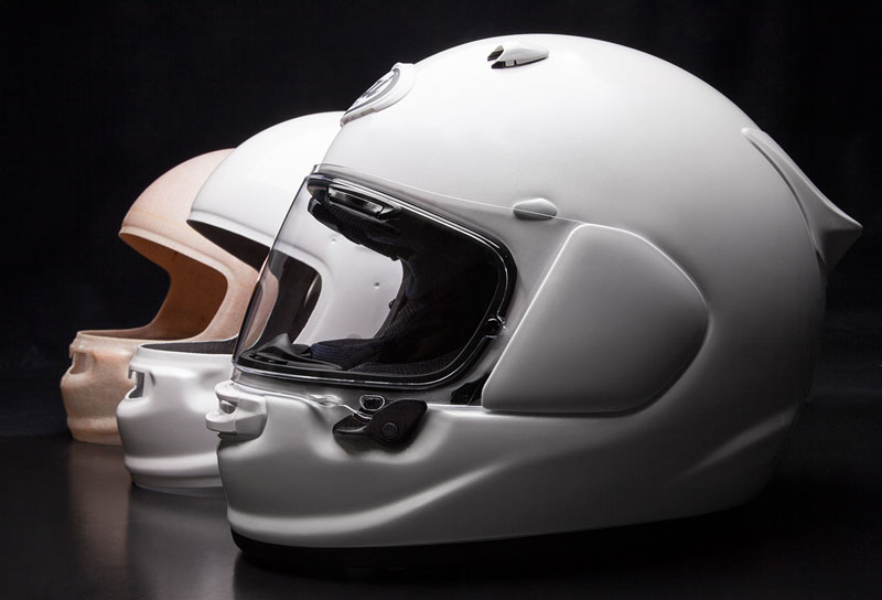 主材料は、通常のグラスファイバーより、6倍のコストのかかる高価な材料の最新のスーパーファイバーをアライが独占使用しています。通常のグラスファイバーよりも繊維密度を高め、引張り強度・圧縮強度ともに40%も高い特殊なグラスファイバーに、さらに改良を重ねた結果生まれたアライ独自の最新素材。「頭を護る性能」には欠かせない強靭で粘りのあるな帽体を構成する最適な素材です。