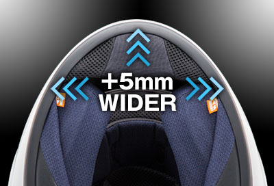 「間口が狭くて着脱しにくい」という声に応えて開発されたニューフォルム。今までのモデルよりも、口元あたりをメインに間口を拡張。前方に5mm、左右それぞれ5mmずつ広げ、脱ぎ被りをよりスムーズにすることを目的に設計されました。アライが初めてのライダーでも、間口のキツさを意識せずに違和感なく着用できます。