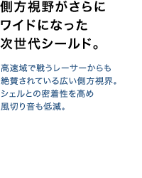 安全性向上のためにフォルムを一新。左右5ミリずつの拡張で側方視野がさらにワイドになった次世代シールド。