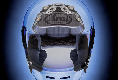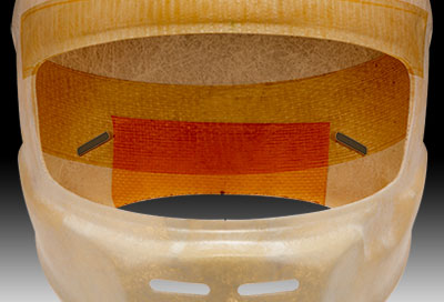 F1用ヘルメットの開発過程で生まれたSFB(Super Fiber Belted)プロテクション。アライ独自のスーパーファイバー製ベルトを上部窓カットラインに並列に配し剛性を強化。万が一の際、この特殊ベルトが開口部分で強い衝撃を受けた際に発生しやすいクラックの広がりを抑制することができる。「剛さ」「軽さ」「粘り」を実現した最強の帽体へと進化している。