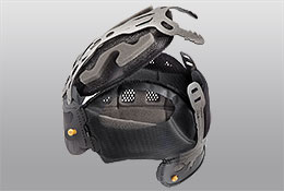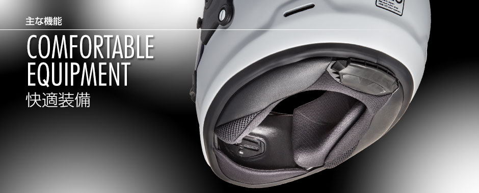 システム内装は、より固定式内装の、「深く、柔らかく」全体を包み込む内装を目指し、頭頂部パッドの形状を見直した。髪型が大きく崩れない形状と位置調整と着脱を可能にし、サイド部厚み調整可能なアジャスタブル機能も兼ね備えた新開発システム内装。