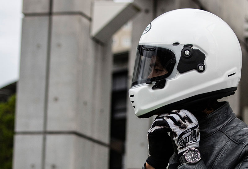 シールドサイドについているポストは、「ティアオフシールド」(オプション)装着用。ティアオフシールドを装着すれば、レーサーを彷彿させるイメージにもスイッチできる。
