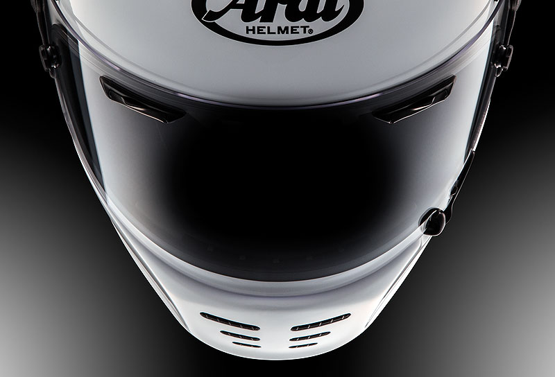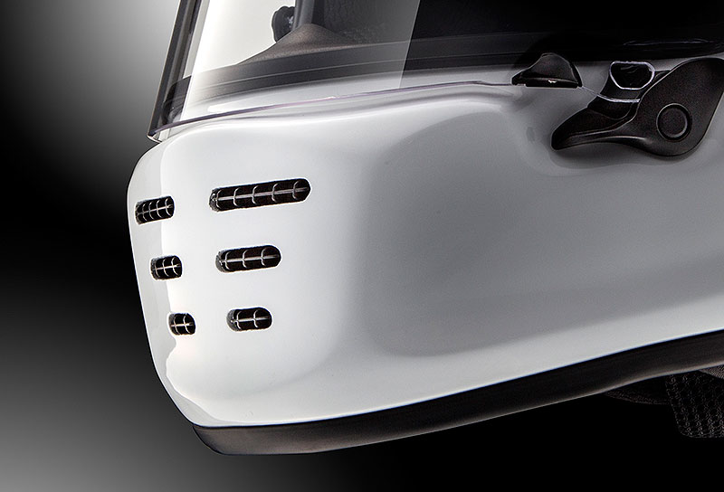 いかなるヘルメットでも吸収できるエネルギーの大きさには限りがあるため、現実の事例では大きなエネルギーはかわすしかない。だから形状も衝撃をかわしやすい滑らかなフォルムと、強靭な帽体をアライは追求してきました。今までシールド取付け部はその開閉のために、わずかな段差を必要としてました。より衝撃をかわす性能を高めるため、実績あるスネル規格のテストラインを目安にシールド取付け部分を24mm下げて、ヘルメット側頭部をより滑らかなフォルムを実現させました。