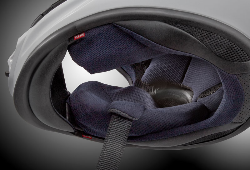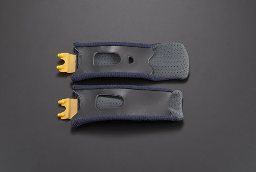 システム内装パッド部分には、取り外し可能な『調節パッド』を、左右側頭部と後頭部に配置。調節パッドを取り除くことで、約5mmずつ緩くすることができます。標準仕様でキツさを感じる場合には、簡単に自分の頭のサイズに微調整が行えます。(取扱説明書を良く読んでから、調整してください)