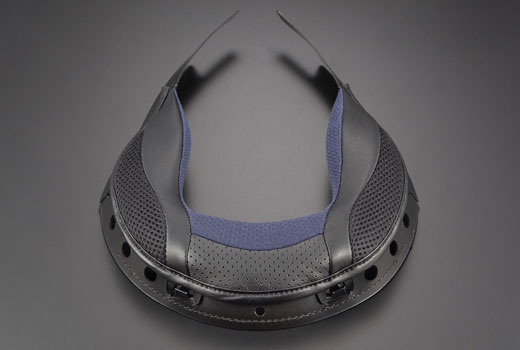 システム内装は、固定式内装の「深く、柔らかく」全体を包み込む内装を目指し、頭頂部パッドの形状を見直しました。髪型が大きく崩れない形状と位置調整と着脱を可能にし、サイド部厚み調整可能なアジャスタブル機能も兼ね備えた新開発システム内装です。