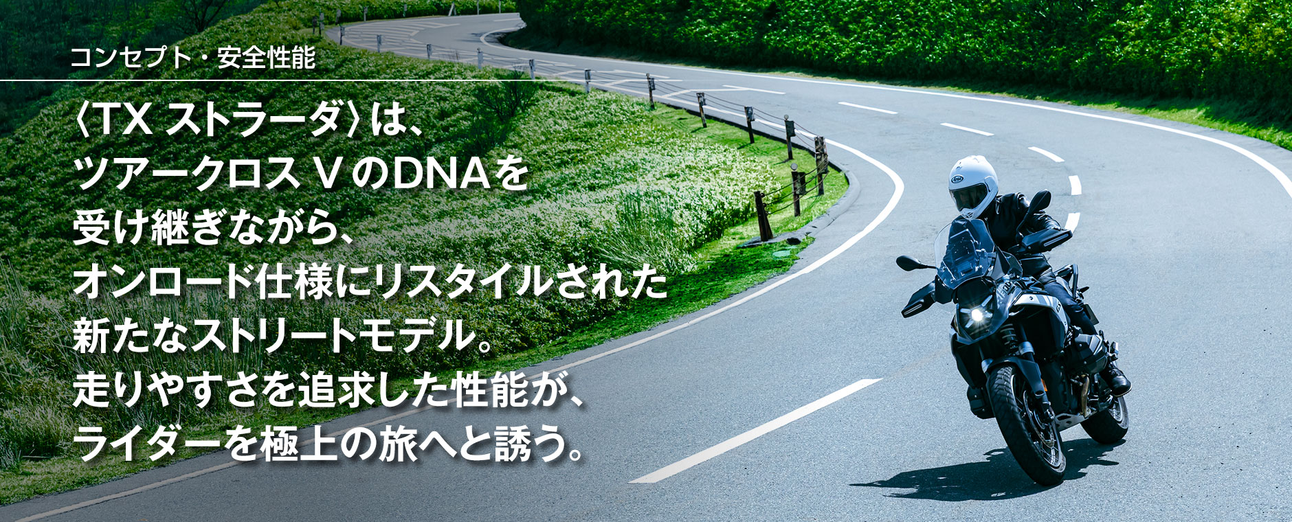 マルチパーパス〈ツアークロスV〉のオンロードスタイルをベースに、専用ホルダーを新たに採用した〈TXストラーダ〉。 新設計のホルダーにより、シールドと帽体の一体感がさらに向上し、全体の完成度が高められました。形状のつながりが滑らかになったことで空力特性も大きく改善され、「かわす性能」を最大限に引き出す洗練されたフォルムへと進化しています。 さらに、空力効率の向上により、高速走行時に発生しがちな風切り音も大幅に低減。ヘルメット内の静粛性が高まり、長時間のライディングでも快適な環境を保ちます。