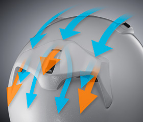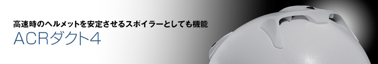 ワンタッチで3つの排気口が同時に調整できる『ACR(エア・コントロール・リア)4ダクト』は、後方に3つの排気口を設けたことで、排気パワーを格段に高めています。3つある排気孔それぞれにインダクションポッドを新設し、より負圧効果を上げることで内部の熱気を強力に排出します。高速走行時には、ヘルメット上部の空気の流れを切り離し、気流を整流するスポイラー効果で、ヘルメットの安定性を向上します。全開と半開、2段階のスイッチ操作で排出量の調整ができます。