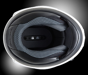 ヘルメット下部のエッジを守るモール。ESF(エッグ・シェイプド・フォルム)のラインに合わせ、ヘルメットと一体化した美しいフォルムを形成。ESFの空力効果である安定性・静粛性を高める効果があり、より空気の流れをスムーズにする。また、モールの継ぎ目をなくし、引っかかりがなくなることでメンテナンスも容易にしました。