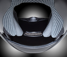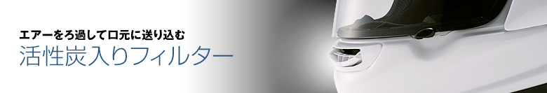 マウスシャッターから口元へエアーを送るダクトには、脱臭効果 のある活性炭入りのフィルターが設置されています。活性炭の表面にある多数の小さな孔が排気ガスを吸着し、交通 量の多い街での走行においても、できるだけ排気ガスを取り込まない工夫がされています。