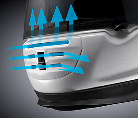 通常のマウスシャッターと同様に、2種類のモードに調節できます。1ノッチ下げると、シャッターが半開状態になり、「デフロストモード」になります。インテークからの気流をシールド内面に吹き付けることで、シールドの曇りを解消させます。また、シャッターを全開状態にすると「インダクションモード」になります。FFS(Free Flow System:呼吸により排出された湿った息をヘルメット外に強制排気するシステム)との相乗効果で、口元へ風を送り走行中の風の巻込みや息ごもり、風切り音などの不快感を軽減します。 |