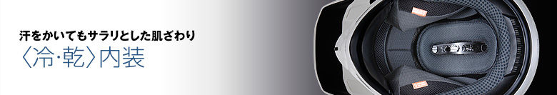 天然素材のように水分を吸収する〈冷・乾〉内装は、汗をかいてもベタつかず、さらりとしたかぶり心地を保ちます。脱ぎかぶりの際に感じるベタつき感がほとんどありません。