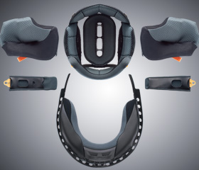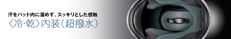 汗を吸収し、さらりとした快適さを持続させる新素材を採用した〈冷・乾〉内装。運動量や走行時間による、ムレやベタつきをおさえ、走りの集中力を高めます。さらに、システムパッドとネックパッドの一部には、超撥水生地を使用。雨天走行時のヘルメット下部からの浸水を低減します。夏などの暑い時期には、流れ落ちる汗を溜めずスッキリとした感触を保ち、汗吸収によるヘルメット重量バランス悪化防止にも貢献しています。