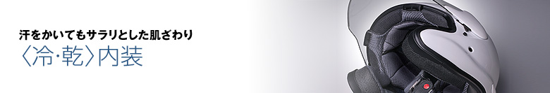 天然素材のように水分を吸収する〈冷・乾〉内装は、汗をかいてもベタつかず、さらりとしたかぶり心地を保ちます。脱ぎかぶりの際に感じるベタつき感がほとんどありません。