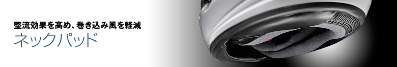 厚みのある『ネックパッド』により、ヘルメット後方下部と、ライダーの首との隙間を埋めることで、高速走行時における巻き込み風や、耳障りな風切り音を軽減。静粛性、フィット感ともに優れているため、かぶり心地が良く、疲れにくいため、走りの集中力を持続させることができます。