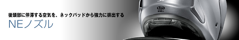 ネックパッドに設けられた『NEノズル2』により、ヘルメットの下部の排気効率がさらに向上しました。エアーインは、ディフューザーとインナーサイドダクト。耳周辺の熱を帯びた空気や、後頭部に停滞するエアーを、走行時の負圧を利用して、ネックパッドの排気ノズルから強力に排出し、ヘルメットの内部環境を快適に保ちます。