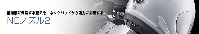 ネックパッドに設けられた『NEノズル2』により、ヘルメットの下部の排気効率がさらに向上しました。エアーインは、ディフューザーとインナーサイドダクト。耳周辺の熱を帯びた空気や、後頭部に停滞するエアーを、走行時の負圧を利用して、ネックパッドの排気ノズルから強力に排出し、ヘルメットの内部環境を快適に保ちます。