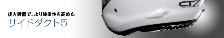 サイドダクト5は、頭部ベンチレーションでは除去しきれなかったヘルメット下部や耳周りなどに停滞する熱気を負圧によって排出することで、内部を常に快適な環境に保つベンチレーションです。より後方へ設置することで、風きり音を低減し、静粛性をさらに高めています。リブのラインと美しく一体化されたフォルムは、優れた整流効果を発揮し、ヘルメットの安定性を向上させます。