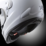 専用設計のフォルムをベースに、帽体の裾部分に段差を設けた独自のハイパーリブ構造で、シェル剛性を強化。後方のサイドエグゾーストダクトへと滑らかにつながる造形は、機能に裏付けられた精悍なプロフィールを主張しています。さらに、ダクト周囲にもリブを設け、ダクトと帽体とをフラッシュサーフェイス化し、風切り音の低減や、さらなる帽体剛性の強化を実現しています。