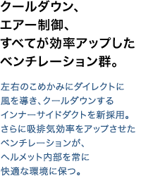 ブローシャッターから取り入れられたフレッシュなエアーを、空気の滞りやすい左右のこめかみ方向へ誘導する。 |