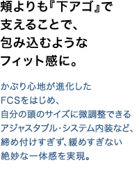 下アゴから包み上げるような新しいフィット感で、頬部を強く圧迫することなく、頭部とヘルメットの密着性を向上。 |