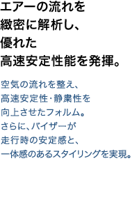 上部2カ所のディフューザーと、下部両サイドのサイドエキゾーストが、ヘルメット後部面を直線的に囲み、さらにエアロスタビライザーとの相乗効果を加え、優れた整流効果を発揮。 |