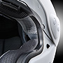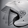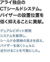 デュアルピボット開閉システムにより、シールド全開時の高さを抑え、バイザーは低くシェルに近づき、走行時の安定感を向上させている。