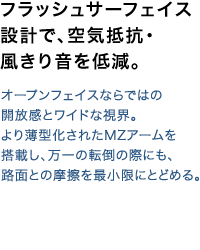 より薄型化されたMZアームを搭載し、フラッシュサーフェイス設計により、空気抵抗・風きり音を低減している。