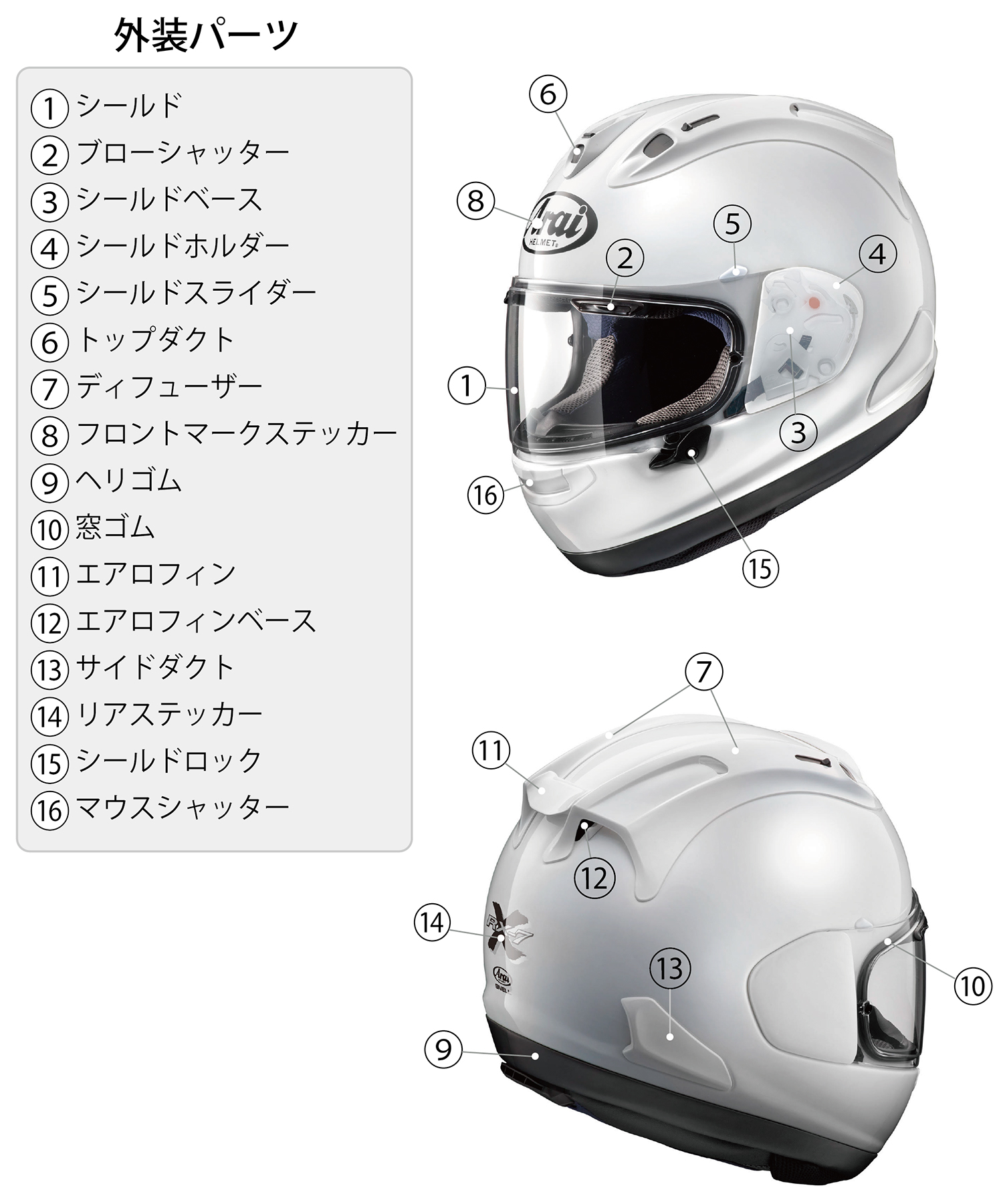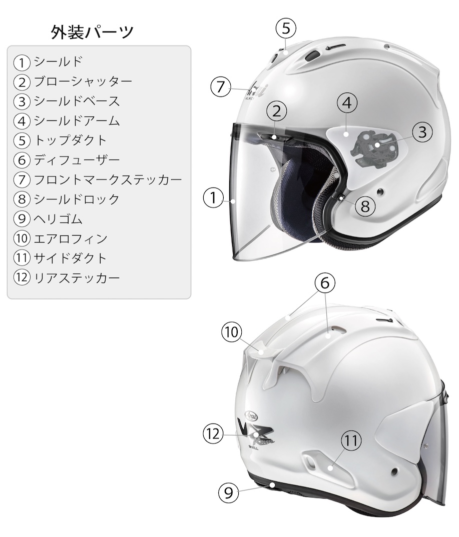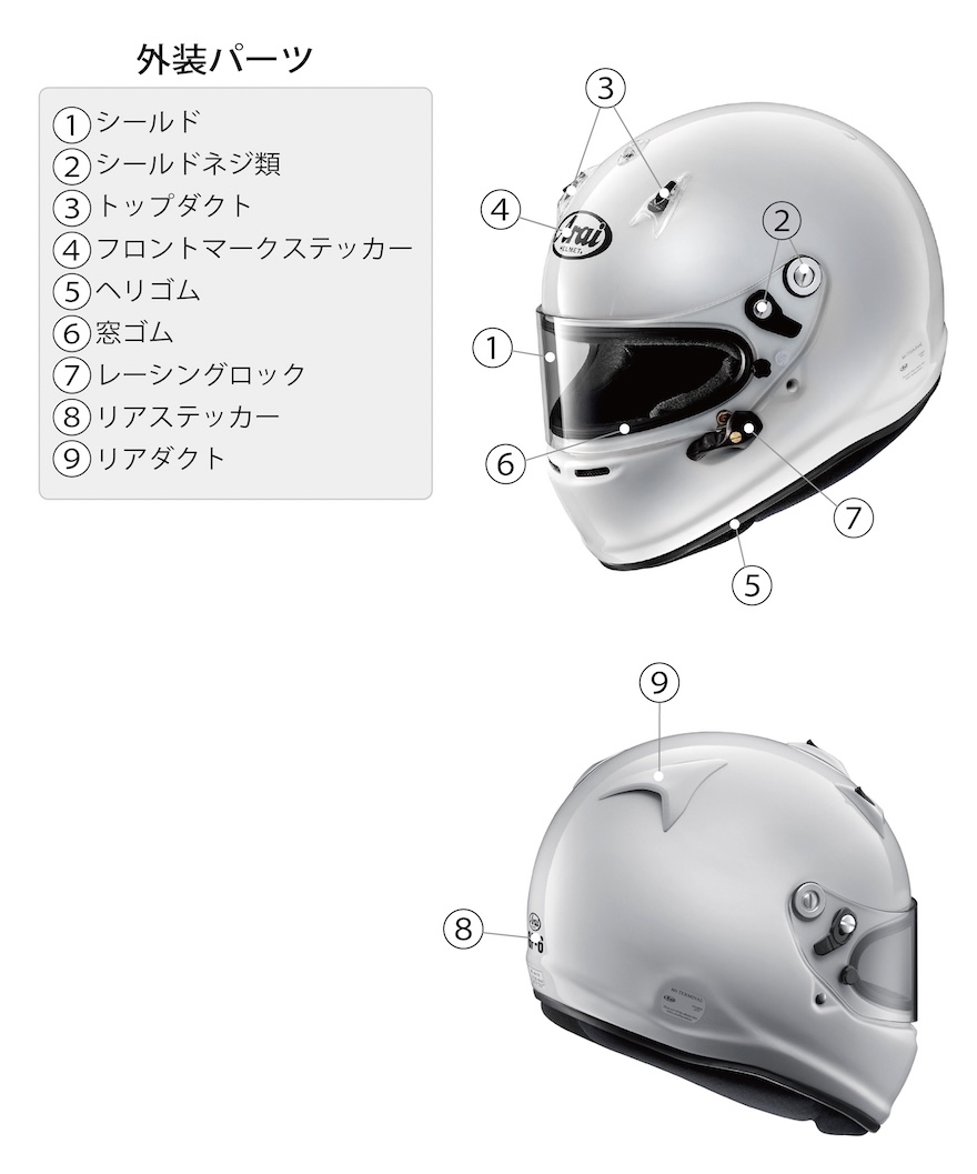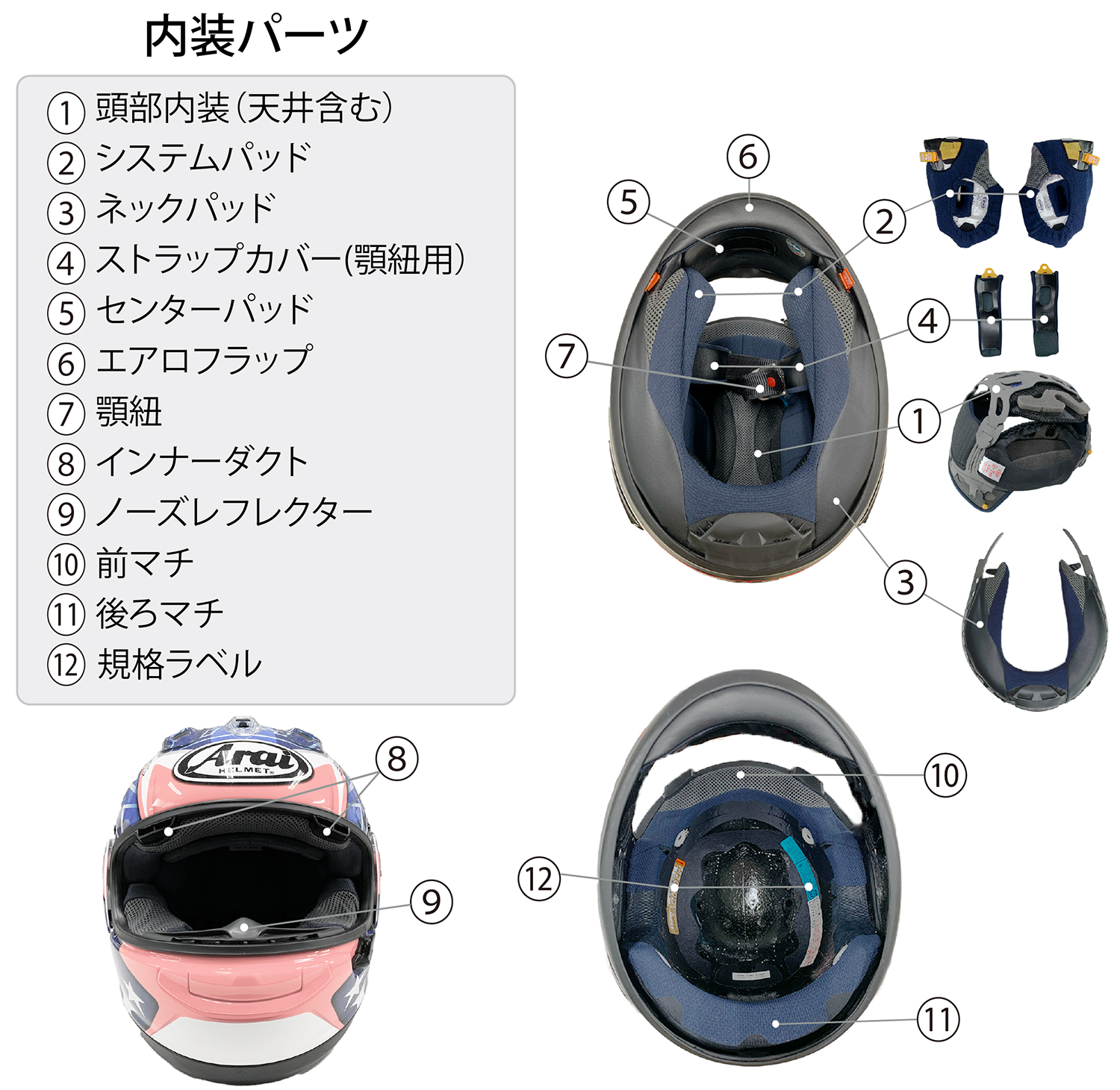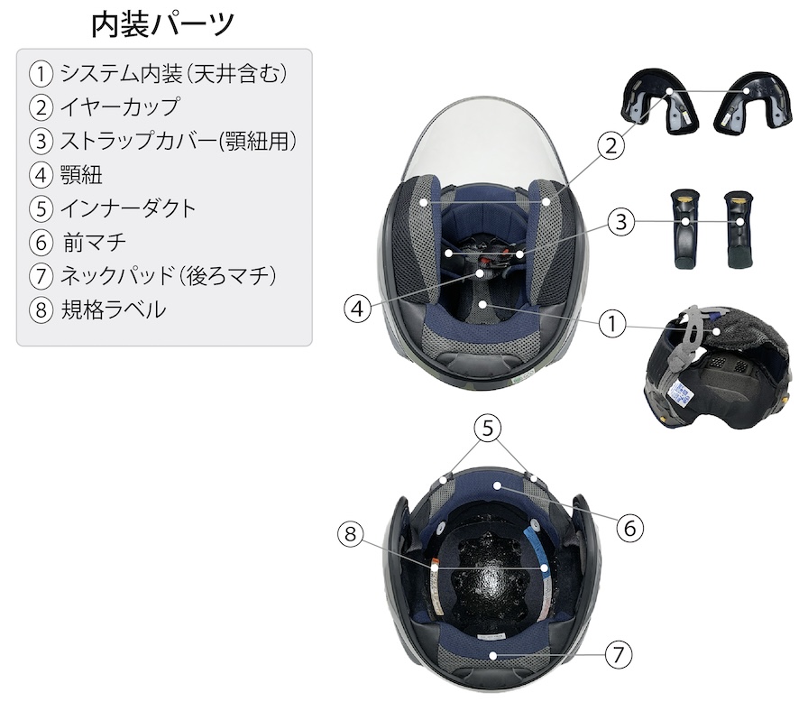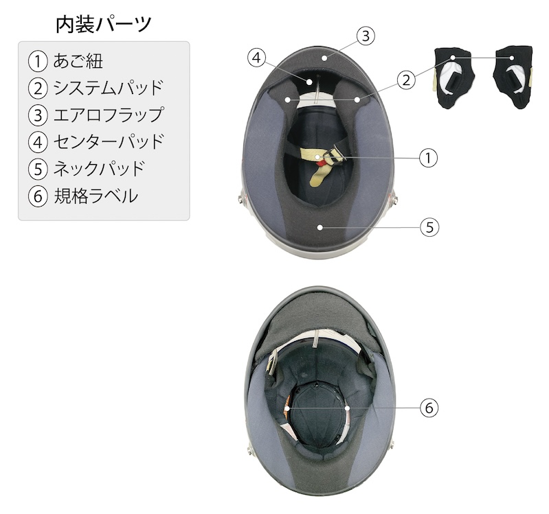 各種ナンバー記載箇所および各パーツ名称につきましては以下ボタンをクリックの上、ご確認をお願いいたします。二輪ヘルメット
