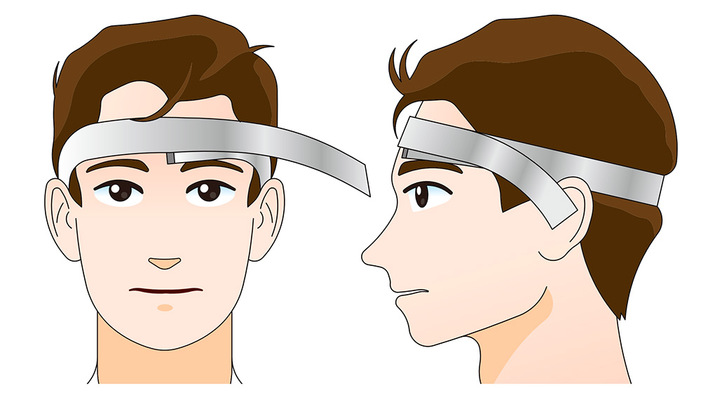 まゆの上、丁度おでこのいちばん高い位置です。おでこの位置から水平に後ろに回した位置が、後頭部のいちばん高い位置になります。