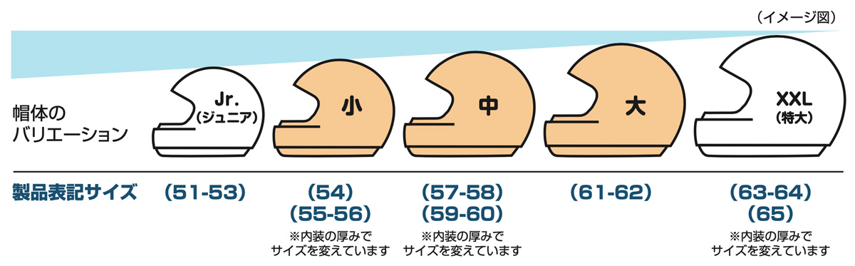 - 同サイズであれば、基本的にどのヘルメットでも内径は同じです。しかし、モデルによって使用される生地や内装構成の違いがあり、フルフェイスやオープンフェイスのシェル形状によっても、実際はサイズ感が異なって感じられる場合があります。