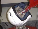 真A)にヘルメットを被せ、それを丸ごと衝撃面に落下させて行います(写真B)。そして、落下時にセンサーが受けた情報から、ヘルメット越しの衝撃量